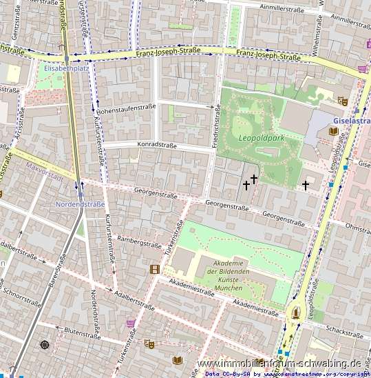 Unser Immobilienangebot befindet sich in der Georgenstraße. Sie verläuft in Ost-West-Richtung und trennt die Maxvorstadt im Süden von Schwabing im Norden. Beginnend an der Leopoldstraße im Osten endet sie an im Westen. Die Immobilie befindet sich am Anfang der Straße, nahe der Leopoldstraße, wo viele Prachtbauten vorhanden sind. Verkehrsmäßig ist die Georgenstraße eine Verbindungstraße und trotz relativer Zentrumsnähe verhältnismäßig ruhig. Vornehmlich finden sich in der Straße Wohnungen, kleinere Läden, Cafés, Restaurants und sonstige Kleingewerbebetriebe.
